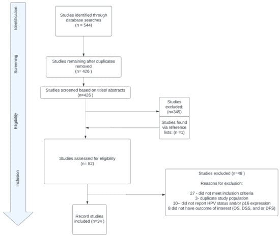 In our review, we conducted a multivariate analysis and found that p16 positivity was associated with improved OS and DSS in a subset of published studies. Specifically, in 3 out of 11 (27%) studies, p16 positivity was associated with improved OS, and in 4 out of 7 (57%) studies, p16 positivity was associated with improved DSS. In comparison, HPV positivity was not significantly associated with improved OS in any of the 10 studies analyzed (0%), and it was associated with improved DSS in only 3 out of 10 (30%) studies. Most of the included studies in our review demonstrated good methodological quality, with a majority achieving a Newcastle–Ottawa Scale (NOS) score higher than 7 and a median total score of 7 (IQR 7–8.25). However, it is important to acknowledge the limitations of our systematic review. We did not include unpublished studies or studies published in languages other than English, which may introduce publication bias and limit the comprehensiveness of the evidence base. Furthermore, another limitation in our study arises from the observed variability in the definitions of p16 positivity among the twenty included studies that assessed p16 status. Out of these studies, six [4,20,24,26,29,48] employed a quantitative measurement approach, while twelve [13,19,21,22,23,25,28,30,42,45,47,49] relied on descriptive criteria. Additionally, Bethune et al. [46] and Chahoud et al. [4] utilized both methodologies, reporting both quantitative and descriptive elements to define p16 positivity. The existence of such diverse definitions for p16 positivity presents a challenge in drawing definitive conclusions and synthesizing the findings across studies.