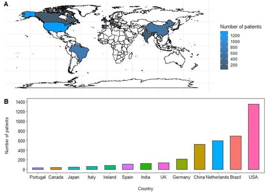 (A,B) Original geographical distribution and bar graph representation of number of patients included in the study from 1970–2022.