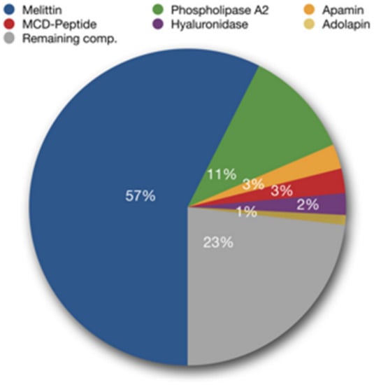 Main bee venom components (adapted from Bee Venom Lab LLC, Georgia). The composition of the venom depends on many factors, including the region of the world and the time of year when the venom is collected [11].