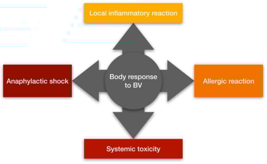 BV can cause both mild and severe clinical effects depending mainly on the number of stings. Clinical symptoms after a sting can be divided into local inflammatory reactions, allergic reactions, anaphylactic shock and systemic toxicity (Figure 2) [18]. People with atopy and a family history of BV allergy have a higher incidence of severe sting reactions [19]. PLA2 is considered the main compound that induces sensitization of mast cells to IgE antibodies, although hyaluronidase and melittin are also responsible for this effect [18,20]. Local inflammatory reactions are characterized by pain, swelling, erythema and itching at the sting site. These reactions occur in most non-allergic individuals and usually subside within 24 h [21]. Allergic reactions to BV are IgE-dependent and are classified as type I hypersensitivity reactions. They appear about 10 min later after the sting, and the symptoms may vary in severity [20]. People with allergies may develop hives, pruritus, angioedema, vomiting and diarrhea [22]. In some cases, allergic reactions can lead to an anaphylactic reaction causing bronchospasm and anaphylactic shock leading even to death [21]. Systemic toxicity occurs independently of immune mechanisms, while being dependent on the volume of venom introduced into the body. Systemic toxic reactions are always considered severe and are triggered by multiple bee stings (approximately 50 simultaneous stings). Patients experiencing a systemic toxic reaction experience dizziness, nausea, vomiting or diarrhea. In such cases, myocardial damage, liver damage, and rhabdomyolysis leading to acute renal failure and coma may occur [18,23]. The broad therapeutic potential of BV should not cause one to underestimate possible side effects and the possibility of an allergic reaction, as evidenced by the case of a Spanish woman who died due to an anaphylactic reaction to acupuncture from live bees described in recent years [24]. Unfortunately, there is no antivenom that can be used for people who are stung and are allergic to BV. This is due to the low immunogenicity of BV proteins (e.g., melittin), which makes it difficult to immunize animals in order to obtain high antibody titers in their plasma and, consequently, significantly complicates the work on bee antitoxin [25].