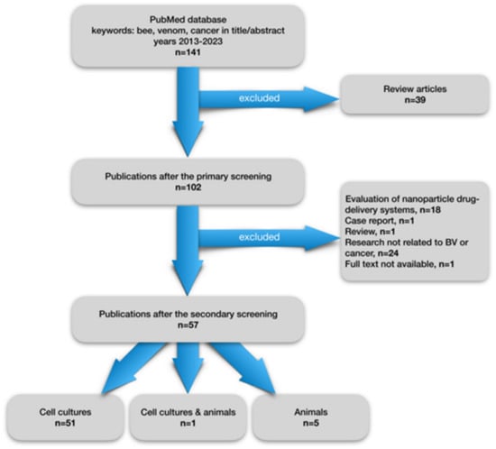 Already in the early 1950s, the effect of apitoxin on the colchicine-induced carcinogenesis process was described [26]. In turn, the results of the analysis of causes of death for professional beekeepers compared to the rest of the population suggested the oncoprotective potential of BV, especially in the case of lung cancer [27]. From the early 1980s, publications containing the results of research on the anti-cancer properties of BV began to appear. Currently, the scientific literature contains many publications on preclinical studies concerning the effect of venom and its main components, most often melittin, on the growth of cancer cells. In order to present the latest reports on this topic, we have collected original publications from the last ten years, present in the PubMed database. The publication selection flowchart is shown in Figure 3. Out of 141 publications from 2013–2023 searched for by the words “bee”, “venom”, “cancer” present in the title or abstract, 102 were selected, rejecting review publications. From the rest, 57 studies on the impact of venom on cancer development were selected rejecting publications that were not directly related to the study of the anticancer properties of BV. Fifty-one publications concerned studies using cell cultures of various cancer cell lines, 5 studies were conducted on animals, and one study was performed on both cultures and an animal model. Basic information on studies is presented in Table 1 and in Table 2. The number of studies on the potential use of BV in the treatment of cancer has increased significantly in recent times. By the end of May 2023, eight publications from this year have already been published in the PubMed database, the most among the analyzed years (2013–2023), despite the fact that it is not yet halfway through the year. This indirectly shows the interest of the world of science in new agents with a possible anti-cancer effect, including BV.