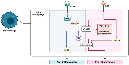 In a healthy state, inflammation is a response to external factors that helps to restore homeostasis [28]. However, chronic inflammation can increase the risk of carcinogenesis. Before the formation of tumors, tumor-promoting inflammation can occur and support tumor growth through suppression of the immune system, promotion of neoangiogenesis (the generation of new vascular networks to supply cancer cells), and oncogenic mutations [29]. Cell death within the tumors could lead to the liberation of damage-associated molecular patterns (DAMPs), like high mobility group box 1 (HMGB1), heat shock proteins (HSPs), or ATP [5,30]. The released DAMPS can activate macrophages and dendritic cells, causing anti-tumor immunity stimulation. Chronic stimulation can result in immunosuppression via the elevated production of interleukin-10 (IL-10), which suppresses the expression of pro-inflammatory cytokines and promotes the formation of regulatory T cells (Tregs) (Figure 1) [31]. In addition, macrophages can contribute to tumor-promoting inflammation through the secretion of immunostimulatory cytokines, such as interleukin-6 (IL-6) [32], and tumor necrosis factor-alpha (TNFα) [33]. These cytokines can stimulate the immune response, backing the tumor growth and survival of cancerous cells [34]. TNFα activates the nuclear factor kappa-B (NF-κB) pathway upon binding to TNFR1/2 receptors. TNFRs (tumor necrosis factor receptors) are membrane proteins that activate cell death. Activation of this pathway could lead to the control of target gene expression (e.g., vascular endothelial growth factor (VEGF) and IL-6) and the stimulation of neo-angiogenesis. IL-6 could then promote cell proliferation and differentiation [35] via the JAK/STAT3 pathway [36].