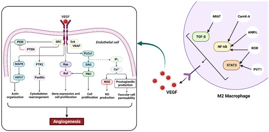 Macrophages are essential in the development of cancer due to their ability to promote angiogenesis. Their presence is often correlated with increased blood vessel density in the tumor microenvironment [43]. To support the swift proliferation of malignant cells, the tumor requires a high supply of nutrients and oxygen which are delivered through a capillary network formed during angiogenesis [44]. The released growth factors in the tumor microenvironment are responsible for the regulation of this process. However, the obligation and structure of the newly made vascular tissues are often abnormal due to poor regulation. This property leads to the elevated permeability of vessels and connections to disease development. Considering the elevated rate of cell death in tumor tissues, TAMs are attracted to hypoxic areas to stimulate the formation of new blood vessels [45]. The transcription factor HIF1α (hypoxia-inducible factor α) is an oxygen-dependent transcriptional activator consistently observed in macrophages. It plays critical roles in the angiogenesis of tumors, regulates the response to hypoxic stress (by switching from aerobic to anaerobic metabolism), and induces CCL2, CXCR4, and endothelin expression as HIF1(hypoxia inducible factor-1) target genes [46], which could lead to macrophage recruitment into tumors [47]. In addition, the process of neo-angiogenesis is adjusted by various elements which are produced by TAMs, including platelet-derived growth factor (PDGF), vascular endothelial growth factor (VEGF), matrix metalloproteinases (MMPs), and angiopoietin-1 [48]. These factors play a role in the proliferation and maturation of endothelial cells, the chemotaxis of macrophages and ECs [48], and the breakdown of the extracellular matrix (to allow for the formation of novel vascular sprouts) [49]. PDGF released by TAMs and platelets could promote the infiltration of pericytes, which are important for vessel maturation and remodeling [44]. They can also release Angiopoietin-1, which helps to stabilize newly formed vessels by binding to the Tie-2 receptor on endothelial cells. Tie 2 is a tyrosine kinase receptor with a critical function in vascular stability. Tie-2 receptor-expressing monocytes (TEMs) are responsible for enhancing the blood vessel formation of macrophages in tumors and may act as precursors of proangiogenic TAMs [50]. Therapeutic targeting of these pathways may be a potential approach for cancer treatment (Figure 2) [5].