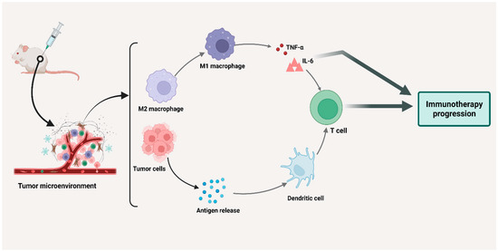 The released DAMPS due to cell death within the tumors can activate macrophages and result in immunosuppression via the elevated production of IL-10, which suppresses the expression of pro-inflammatory cytokines and promotes the formation of Tregs. Moreover, macrophages can contribute to the secretion of IL-6 and TNFα, leading to cancerous cell survival. In addition, TNFα activates the NF-κB pathway upon binding to the TNFR1/2 receptor, controls the expression of VEGF, IL-6, and the stimulation of neo-angiogenesis. IL-6 could then promote cell proliferation and differentiation via the JAK/STAT3 pathway. Phagocytosis, the propagation of TNFα, and interleukin-1 beta (IL1β) can induce macrophage recruitment.