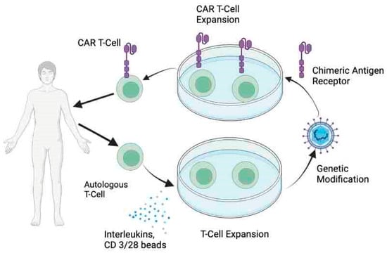 Chimeric antigen receptors (CAR) are recombinant receptors, which, when engineered into the T lymphocytes, facilitate targeted antigen binding and T cell activation, thus ensuring immune attack on tumors [22]. The generation of CAR T-cells is an intricate and complex process that involves engineering T cells to express tumor-specific antigen-targeted CARs on the surface of T cells to ensure a targeted response. The process of autologous CAR T-cell manufacturing is summarized in Figure 1. CARs have evolved over time to include more costimulatory domains which have improved their efficacy and proliferation. Currently, fourth-generation CARs, also known as TRUCKS (T cells redirected for antigen-unrestricted cytokine-initiated killing) with the ability to release cytokines, upon engagement of CARs with target tissues are being developed. These CARs have been engineered to code for an array of cytokines including IL-7, IL-12, IL-15, IL-18, IL-23, and their combinations to enhance CAR cytotoxicity and efficacy [23].