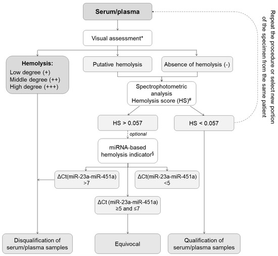 Scheme of quality control process based on analytical techniques for monitoring hemolysis in serum/plasma samples. * The visual assessment of potential blood hemolysis (rupturing of erythrocytes) was performed according to the following scale: −, no discernable hemolysis (serum/plasma color is pale yellow or yellow)—sample suitable for further processing; +/−, suspected hemolysis (serum/plasma color is pale pink)—sample may be suitable for further processing but requires additional confirmation by spectrophotometric technique and optionally qPCR-based approach. +/++/+++, low, medium, or high degree of hemolysis (serum/plasma tinted red in varying degrees)—sample is not suitable for further processing; refrain from carrying out further procedure. # Spectrophotometric analysis based on oxyhemoglobin absorbance measurements at λ = 414 nm and at λ = 385 nm (as a lipemia indicator) using NanoDrop 2000c spectrophotometer with cuvette module (100 µL) (Thermo Fisher Scientific, Waltham, MA, USA) [15]. Range: Hemolysis score (HS): HS < 0.057—non-hemolyzed plasma/serum specimens; HS > 0.057 hemolyzed plasma/serum samples. § Quantification RT-PCR method based on hsa-miR-451a and hsa-miR-23a-3p expression levels [16]. miRNA-based hemolysis indicator formula: ΔCt (miR-23a–miR-451). Range: ΔCt > 5—possible erythrocyte miRNA contamination; ΔCt > 7–8 or more—high risk of blood hemolysis.