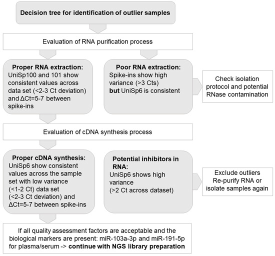 The assessment of RNA integrity is a critical step in obtaining meaningful gene expression data. The RNA integrity number (RIN) scale ranges from 1 (degraded) to 10 (intact) and is a widely used metric to assess the quality and integrity of RNA samples for omics studies, particularly transcriptomics. While there is no universally agreed-upon threshold for the RIN value, a common recommendation is to aim for a RIN value of 7 or higher [19]. During the selection of biospecimens from MUB Biobank, RNA isolates with RIN ≥ 7 are used for omics analysis. Key QC parameters of RNA purified from the serum samples include the efficiency of RNA extraction, absence of nucleases, and any inhibitors of enzymatic reactions. To reliably assess RNA quality from serum and plasma samples, the qPCR method based on a set of synthetic RNA spike-ins and endogenous microRNA assays were used. All samples were controlled using the ExiSEQ-NGS sample QC kit–small RNA/microRNA (Exiqon Inc. Vedbaek, Denmark) before proceeding with microRNA profiling by NGS (Figure 3).