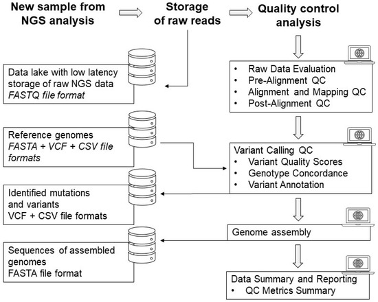 Continuous evaluation and improvement of QC protocols are necessary to adapt to evolving technologies and best practices in NGS. It ensures that the data used for downstream analyses is of sufficient quality to produce more accurate and meaningful interpretations, reducing the risk of false discoveries or incorrect conclusions. The QC process for NGS starts with the storage of raw FASTQ data in a dedicated database within the Bioinformatic Cluster managed by MUB. Data quality checks are performed on the reads to assess their overall quality, including metrics such as sequencing depth, read length, and base quality scores. The next step involves mapping the reads to a reference genome to determine their alignment and identify any potential variations or mutations. This is followed by variant calling where specific genetic variations, such as single nucleotide polymorphisms (SNPs) or insertions/deletions (indels), are identified and annotated. Additionally, genome assembly is performed to reconstruct the full genome sequence based on the mapped reads. This step allows for the identification of structural variations and complex genomic rearrangements. Figure 4 illustrates the entire process of processing NGS data, starting from the raw NGS data and progressing through data quality checks, read mapping, variant calling, and genome assembly. This visual representation provides a clear understanding of how the NGS data is processed to identify the mutational status. By validating this QC process, including regular evaluation and improvement, we ensure that the NGS data generated is of high quality and can be confidently used for downstream analyses and interpretations.