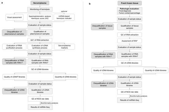 The combined workflow developed to address essential preanalytical and analytical QC in miRNA research conducted on liquid and tissue samples is shown in Figure 5a,b.