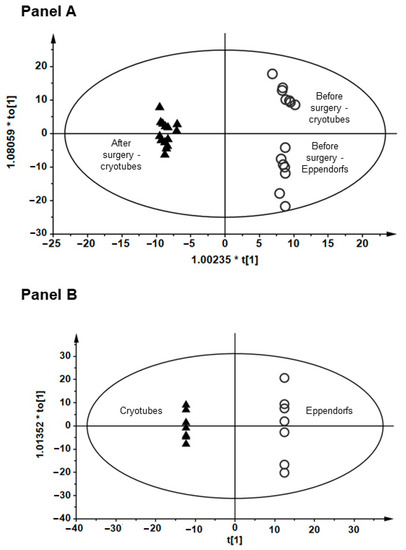 Orthogonal partial least squares discriminant analysis (OPLS-DA) models showing the classification of plasma metabolic fingerprints obtained with liquid chromatography quadrupole time-of-flight mass spectrometry (LC-QTOF-MS) method. (Panel A) (R2 = 0.897, Q2 = 0.364) shows the separation between plasma samples collected from patients before and after the tumor resection surgery. (Panel B) (R2 = 0.993, Q2 = 0.5364) shows the separation between samples stored in cryotubes and Eppendorf tubes.