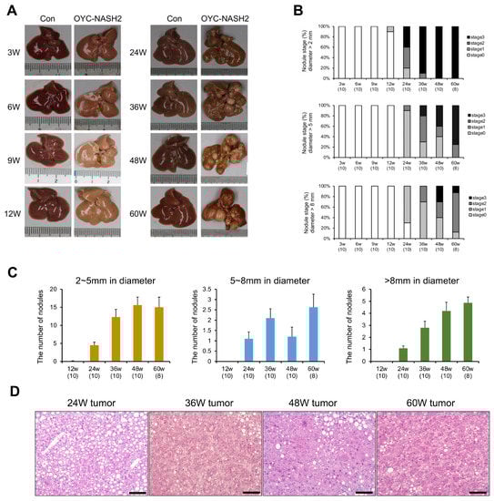 3.2. OYC-NASH2 Diet Induces the Appearance of Nodules in the Liver of Mice at 12 Weeks, and the Formation of Multiple Nodules in All Mice at 24 Weeks