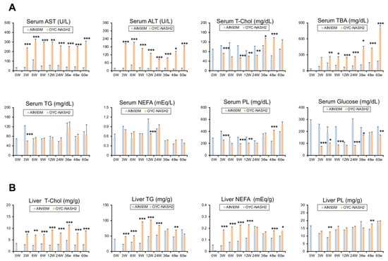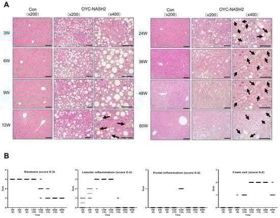 3.1. OYC-NASH2 Diet Feeding for 60 Weeks Results in Increased Liver Weight without Involving Severe Loss of Body Weight