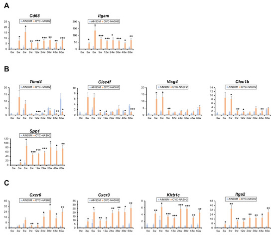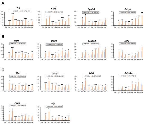 3.5. Time Course Changes in the Expression of NASH-HCC-Related Genes