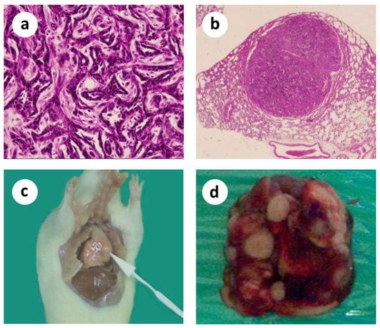 Microscopic histopathological evidence of malignancy and macroscopically visible lung metastases. (a) Primary tumor; (b) Lung metastasis; (c,d) Macroscopically visible lung metastases.