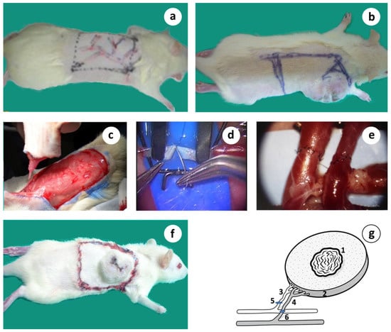 In the microsurgical group, the tumor complex, along with its neurovascular bundle, was surgically prepared, removed from the body, and replanted, as previously described (orthotopic tumor auto-transplantation, Figure 1a–g). An ultrathin semi-permeable membrane was placed under the tumor complex to prevent any potential ingrowth of the newly formed vessels and nerve axons, allowing though the tumor-–host lymphatic exchange.