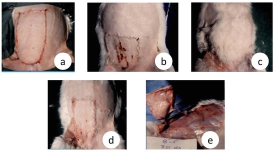 Adverse wound healing effects in microsurgical flaps and contrasting differences with the intact vascular pedicle flap, in rabbits although these 2 surgical preparations are similar regarding the blood flow dynamics. (a) The original size of the microsurgical and the vascular pedicle flap (day 0); (b) Severe contraction, trophic ulcers, and abortive hair growth inside the microsurgical flap area (day 30); (c) In strike contrast, vascular pedicle flap shows superabundant hair growth, light contraction without trophic ulcers (day 30); (d) The real size of the vascular pedicle flap after hair removal showing less contraction and comparing; (e) No evidence of revascularization from the underline vascular bed in a microsurgical flap which is easily separated without dissection or bleeding (day 30), (unpublished data).