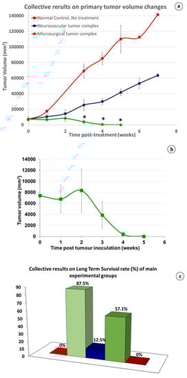 (a) Collective, comparative results on primary tumor volume changes. Redline, no treatment normal control (group 1); An almost linear, and sharp increase in the tumor size. Blueline, partial denervation, neurovascular groups with or without membrane (group 4 and 7): A similar type but with a moderate increase was shown. Greenline, radical and persistent (R&P) denervation, microsurgical groups with or without membrane (group 2 and 6); After an initial, light increase during the first 2 wk. after treatment, tumor deteriorates gradually until its complete and irreversible regression in microsurgical group 2 (*: p value < 0.005 in comparison of microsurgical tumor complex group with both control and neurovascular tumor complex groups). (b) Analytical presentation of the primary tumor volume changes in microsurgical group 2; after an initial moderate growth for about 2 wk. the tumors started to constantly decrease in size until their elimination, in about 5–7 wk. after treatment. (c) Collective results on LTS rate: from left to right: 0% = Normal control group, no treatment (group 1); 87.5% = microsurgical groups, R&P denervation (groups 2 and 6), 12.5% = neurovascular groups, partial denervation (groups 4 and 7); 57.1% = microsurgical group with 2 or 3 tumors (group 10); 0% = 2-step destruction of tissue continuity, with or without membrane (groups 5 and 8).