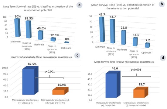 Comparison of LTS rate (a) and MS time (b) vs. the classified relative estimation of the reinnervation potential uncovered an inverse relationship of the therapeutic response to the reinnervation potential. Minimum (group 2) = microsurgical group with membrane; Close to minimum (group 6) = microsurgical group without membrane; Moderate (group 3) = vascular group; Close to optimum (group 4) = neurovascular group with membrane; Optimum (group 7) = neurovascular group without membrane. Overall LTS rate (c) and MS time (d) vs. microvascular anastomosis performance; Groups 2, 6 = microsurgical tumor complex with or without membrane, Groups 1, 3, 4, 7, 9 = Normal control, Vascular group, Neurovascular group with or without membrane, and Ischemia sham control group.