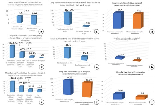 (a) Cumulative results of the MS time in all operated but non-cured subjects has shown that it is significantly less (p < 0.05) compared to the untreated, normal control animals; (b) LTS rate and MS time (c) correlation after destruction of host–tumor complex tissue continuity: Destruction of host-tumor continuity (groups 2, 6) = microsurgical group with or without membrane, Close to total destruction, no nerve (group 3) = vascular group, Close to total destruction, with nerve (groups 4, 7, 9) = neurovascular group with or without membrane, and no destruction at all (group 1) = Normal control group. LTS rate (d) MS time and (e) correlation after the destruction of host–tumor complex tissue continuity in 1 versus 2 surgical steps shows that destruction in 2 steps eliminates the possibility for long-term survival, significantly suppresses the MST time: Destruction of tissue continuity in 1 step = microsurgical group with or without membrane (groups 2, 6), destruction in 2 steps, with or without membrane (groups 5, 6). Comparison of survival of the microsurgical (f,g) and neurovascular groups (h,i) in correlation to membrane insertion, shows no significant differences in both, LTS rate and MS time: Microsurgical group with or without membrane (groups 2, 6), Neurovascular group with or without membrane (groups 4, 7).