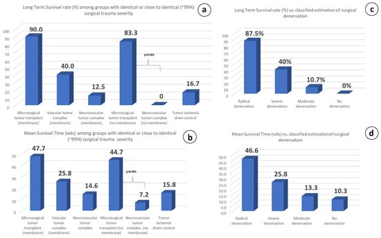 Compared to all of the other groups, microsurgical group 2 showed superiority in all of the recorded parameters; the size of the tumor had the most intense declining course (Figure 6a,b). The LTS rate and MS time were the highest recorded in the study, with (90% and 47.7 wk., respectively) or without a membrane barrier (83.3% and 44.7 wk., respectively) (Figure 9a,b), and all of those values were statistically significant (p < 0.001) compared to normal control group 1 (0% and 10.3 wk., respectively). The importance of the microvascular anastomoses was demonstrated by comparing the data in all of the treated animals, with or without microvascular anastomoses; the LTS rate was 87.5% vs. 15.9% and MS time 46.6 vs. 15.7 wk., respectively, both being statistically significant (p < 0.001) (Figure 9c,d). Statistical analysis among various groups with or without microvascular anastomoses in 64 subjects unveiled the role and contribution of each operation protocol parameter to the results obtained.