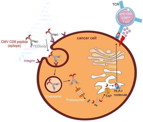 Recently, Jung et al. (2022) described CD8pos T cell epitope-delivering antibodies (TEDbodies) []. TEDbodies consist of a full-length human IgG1/κ antibody with an effector function-silenced Fc domain. The VL and VH domains are designed to facilitate endosomal escape of TEDbodies into the cytosol. The CMV protein pp65-derived HLA-A*02:01 peptide epitope NLV (or an N/C-extended version thereof) was fused to the Fc domain of the antibody. Integrin αvβ5/αvβ3-targeting cyclic peptide ‘in4′ was fused to the light chain N-terminus, which facilitates tissue-homing and receptor-mediated endocytosis of TEDbodies. Of note, integrin αvβ5/αvβ3 is overexpressed in many types of epithelial cancers. Upon binding to integrin αvβ5/αvβ3 on the cancer cell surface, TEDbodies are endocytosed. Owing to the endosomal escape activity of their VL and VH domains, TEDbodies end up in the cytoplasm, where they are cleaved by cytosolic proteasomes, creating precursor CMV peptides with the correct C-terminus. These peptides are then transported by transporters associated with antigen-processing (TAP) into the ER, where residues of the N-extended sequence (if present) are trimmed by endoplasmic reticulum aminopeptidase proteins (ERAPs). Subsequently, the mature epitopes are loaded onto HLA-A*02:01 and enter the ER–Golgi transport pathway. After exocytosis, CMV peptide–HLA-I complexes are presented on the surface of cancer cells, which can then be recognized and eliminated by anti-CMV CD8pos T cells (Figure 1).