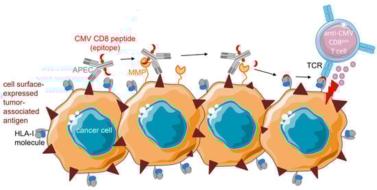 Millar et al. (2020) developed an alternative strategy which circumvents the need for intracellular CMV peptide processing and loading. Antibody–peptide epitope conjugates (APECs) consist of CMV-derived peptide epitopes conjugated to tumor-directed antibodies via a linker []. This linker was designed to be susceptible to cleavage by cancer-associated matrix metalloproteases (MMPs). When APECs bind to the corresponding target antigen on cancer cells this linker is cleaved, after which the CMV peptide epitope is released. Subsequently, the peptide epitope is taken up and presented by an empty HLA-I molecule on the surface of cancer cells. Consequently, these CMV-‘redecorated’ cancer cells are recognizable for elimination by cognate anti-CMV CD8pos T cells (Figure 2). In normal cells, cancer-associated MMPs are essentially absent so that APECs remain intact and the CMV peptide epitope will not become available for HLA-I presentation.