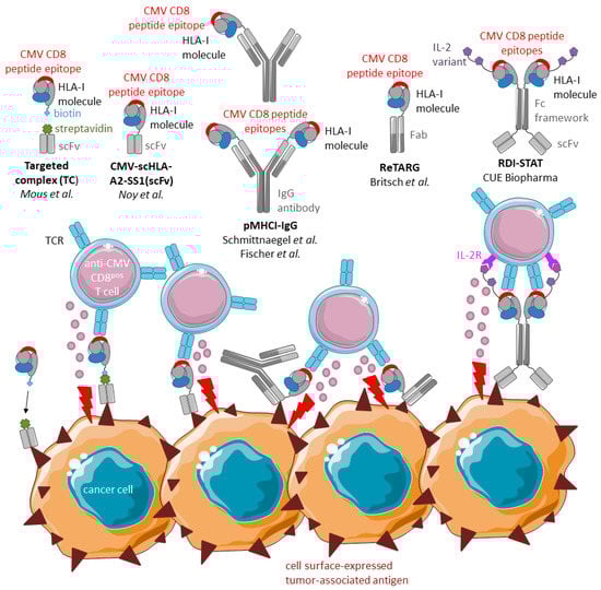 To avoid the requirement for endogenous (empty) HLA-I complexes and bypass potential deficiencies in the antigen-presentation pathway, fusion proteins comprising CMV peptide–HLA-I complexes have been developed. These fusion proteins that redirect anti-CMV CD8pos T cells towards cancer cells are equipped with a CMV peptide-loaded HLA-I/β2M complex fused to an antibody (fragment) moiety directed towards a tumor-associated cancer cell surface antigen (Figure 4).