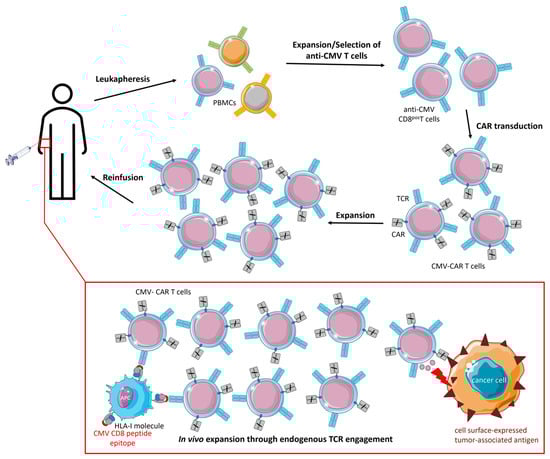 - Wang, X.; Diamond, D.J.; Forman, S.J.; Nakamura, R. Development of CMV-CD19 bi-specific CAR T cells with post-infusion in vivo boost using an anti-CMV vaccine. Int. J. Hematol. 2021, 114, 544–553. [Google Scholar] [CrossRef]