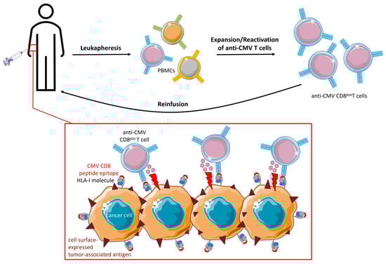 Multiple clinical trials have been performed to determine whether expansion/in vitro stimulation and subsequent ACT could reconstitute anti-CMV CD8pos T cell function in GBM patients. Phase I trials have assessed the treatment of either newly diagnosed or recurrent GBMs. ACT protocols vary across trials but basically consist of the following steps: harvesting of PBMCs from patients through leukapheresis, culturing in growth medium supplemented with HLA-I- and HLA-II-restricted peptide epitopes from CMV, and subsequent stimulation with recombinant cytokines, such as IL-2. The reinfused anti-CMV CD8pos T cells are expected to migrate to the tumor site and recognize and eliminate CMV-positive cancer cells [] (Figure 6). Optimal expansion protocols for anti-CMV ACT are still being developed.