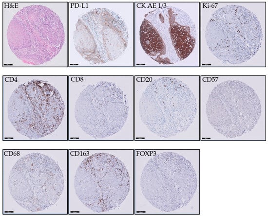 For the staining of the immunohistochemical markers, 3 µm sections were sectioned from the TMA. Sections were stained on a Ventana BenchMark Ultra immunestainer for CD4 (CONFIRM anti-CD4, clone SP35, Ventana Medical Systems, Inc., Tucson, AZ, USA), CD8 (Monoclonal Mouse Anti-Human CD8, clone C8/144B, Dako, Glostrup, Denmark), CD20 (CONFIRM anti-CD20, clone L26, Ventana Medical Systems, Inc., Tucson, AZ, USA), CD57 (Mouse Monoclonal Antibody CD57, clone NK-1, Cell Marque Corporation, Rocklin, CA, USA), CD68 (CONFIRM anti CD-68, clone KP-1, Ventana Medical Systems, Inc., Tucson, AZ, USA), CD163 (Mouse Monoclonal Antibody CD163, clone MRQ-26, Cell Marque Corporation, Rocklin, CA, USA), Ki67 (CONFIRM anti-Ki-67, clone 30-9, Ventana Medical Systems, Inc., Tucson, AZ, USA), and Pan Keratin (anti-PAN Keratin, clones AE1, AE3 and PCK26, Ventana Medical Systems, Inc., Tucson, AZ, USA). See Figure 1 for examples of immunohistochemical staining of the different markers. Visualization was performed according to the manufacturer’s protocol by using UltraView DAB. For all antibodies, antigen retrieval was performed using Cell Conditioning 1 (Ventana). The CD-8 antibody was diluted 1:20; all other antibodies were pre-diluted by the manufacturer. Sections were stained for PD-L1 (clone 22C3, Dako) on a Dako Autostainer Link 48 following the manufacturer’s protocol by using EnVision FLEX visualization system.