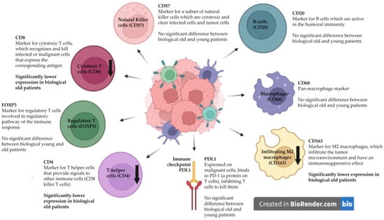 Lower CD163, CD4, and CD8 expression was related to a higher biological age (p = 0.036, p = 0.019, p = 0.026, respectively). The expression of CD68, FOXP3, CD20, CD57, and PD-L1 showed no significant difference between biologically young and older patients.