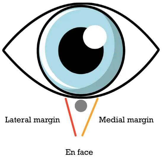 It is critical to ensure histological surveillance of surgical margins in order to reduce the risk of recurrence and maintain unaffected tissue in the eyelid or periocular region. For this reason, two procedures have been developed: the traditional frozen section technique and the Mohs micrographic approach [,]. Mohs micrographic surgery (MMS) is a widely employed technique for the treatment of different types of skin malignancies, such as basal cell carcinoma (BCC). One of the primary benefits of MMS is its ability to preserve uninvolved tissue, which theoretically facilitates easier reconstruction. Consequently, it is regarded as an effective approach for excising BCC [,,]. Excising periocular skin tumors with frozen section control (FSC) has been established as a reliable treatment approach for managing basal cell carcinoma (BCC) as an alternative to MMS []. During frozen section control, when evaluating surgical specimens, there are two methods for processing margin sections: perpendicular to the surgical margin and en face (or parallel) to the surgical margin. Traditionally, perpendicular sections are taken during tumor excision using frozen section control. However, a drawback of the perpendicular slices approach is that it does not examine the entire margin comprehensively. In contrast, the en face sectioning technique enables a comprehensive examination of the entire margin using a relatively small number of sections. To minimize the risk of misinterpreting the histological margin, it is essential to make thin sections. The tumor excision process utilizing CMC-FS involves various techniques, such as mapping the margins of the surgical specimen, tissue inking, precise and thin sectioning, clinical margin assessment, and en face sectioning with margins facing upwards. By employing CMC-FS, this approach effectively achieves oncological radicality comparable to that of Mohs surgeons.