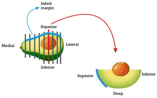 During frozen section control, when examining surgical specimens, there are two approaches for processing margin sections: perpendicular and en face (or parallel) to the surgical margin. The conventional method involves making perpendicular sections during tumor excision. These sections allow for the examination of the tumor’s morphological characteristics in the frozen material and help determine if it extends to the margin. Additionally, they provide information about the distance between the tumor and the margin if the tumor is not present at the margin. However, a drawback of the perpendicular slices method is that it does not examine the entire margin. Since pathologists typically “bread” the tissue into slices approximately 1–2 mm thick, margins in certain areas of the sample may not be assessed unless the fabric block is trimmed.