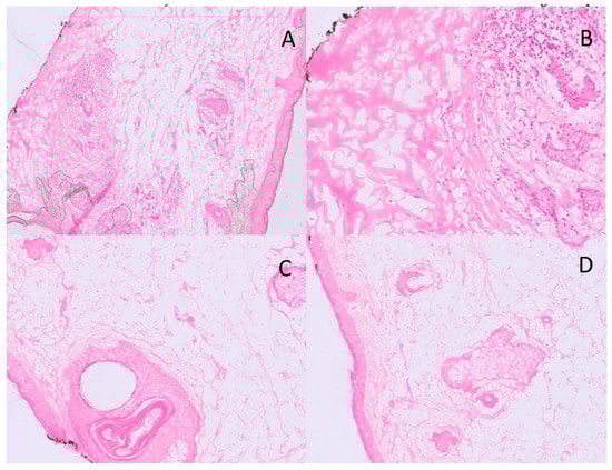 An example of BCC positive margin at low (A) and high (B) power magnification (H&E); in the hypodermis, small nests of BCC are visible, closely related to an inflammatory focus. An example of BCC negative margin at low- (C) and high-power (D) magnification (40×).