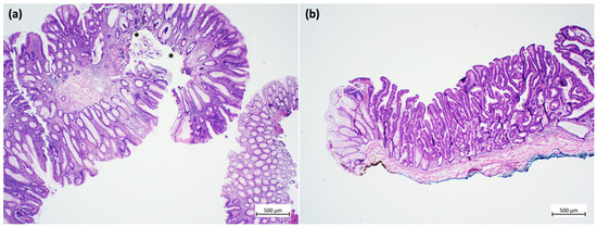 Examples of specimens from endoscopic resections. (a) Low-quality specimen: fragmented portions of a tubulo-villous adenoma with low-grade dysplasia. Due to the fragmentation, inking of the resection margins is not possible, the resection status cannot be assessed, and the submucosa cannot be measured. In addition, thermal artefacts are seen in the depth (asterisks) (hematoxylin and eosin stain). (b) High-quality specimen: one-piece resection of a tubulo-villous adenoma with serrated morphology and focal high-grade dysplasia. Inking can be performed both for the lateral (yellow) and the vertical (blue) resection margins. Thus, the resection status can be assessed, and the submucosal layer can be measured. Thermal artefacts are not seen. (hematoxylin and eosin stain). Images obtained using an Olympus BX41 microscope, Zeiss digital camera Axiocam105 color and a 2 × 0.06 Plan Neofluar objective (Zeiss Zen core 3.5 software). Image processing was performed with Microsoft PowerPoint, Version 2020.
