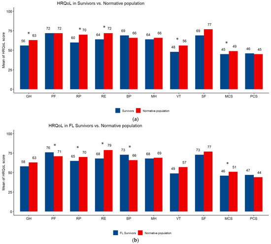 (a) Subscale scores on the SF-12 questionnaire. Differences between survivors of Non-Hodgkin Lymphoma and a sex- and age-matched normative population. HRQoL: health-related quality of life; PF: physical functioning; RP: role limitations/physical health; RE role limitations/emotional problems; VT: vitality; MH: Mental Health; SF: social functioning; BP: bodily pain; GH: general health; MCS: Mental Component Scale; PCS: Physical Component Scale. Higher scores are indicative of better HRQoL. * p < 0.05. (b) Subscale scores on the SF-12 questionnaire. Differences between survivors of follicular lymphoma (FL) and a sex- and age-matched normative population. HRQoL: health-related quality of life; PF: physical functioning; RP: role limitations/physical health; RE role limitations/emotional problems; VT: vitality; MH: Mental Health; SF: social functioning; BP: bodily pain; GH: general health; MCS: Mental Component Scale; PCS: Physical Component Scale. Higher scores are indicative of better HRQoL. * p < 0.05. (c) Subscale scores on the SF-12 questionnaire. Differences between survivors of diffuse large B-cell lymphoma (DLBCL) and a sex- and age-matched normative population. HRQoL: health-related quality of life; PF: physical functioning; RP: role limitations/physical health; RE role limitations/emotional problems; VT: vitality; MH: Mental Health; SF: social functioning; BP: bodily pain; GH: general health; MCS: Mental Component Scale; PCS: Physical Component Scale. Higher scores are indicative of better HRQoL. * p < 0.05.