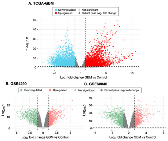 Summary of the DEGs. Volcano plot showing differential expression analysis of genes between GBM and control samples in (A) TCGA-GBM versus GTEx, (B) GSE4290 and (C) GSE68848. Red and blue (or green) points indicate genes with significantly increased or decreased expression, respectively, in GBM specimens compared to controls. The Log2-fold differences between GBM and controls are plotted on the horizontal axis, while the −Log10 p-value differences are plotted on the vertical axis. The horizontal dashed line represents the significance threshold (p value < 0.05 after correcting for multiple comparisons).