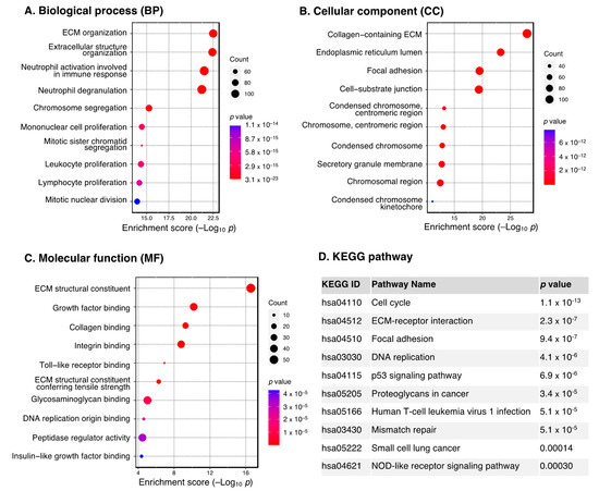 The ten most enriched GO terms for the upregulated DEGs are shown in Figure 2A–C. We found that they were mostly involved in the extracellular matrix (ECM), as evident from the most significant GO terms (BP: extracellular matrix and structure organization, CC: collagen-containing ECM, MF: ECM structural constituent). This is consistent with KEGG results, which showed extracellular matrix–receptor interaction as one of the most significantly enriched pathways (Figure 2D).