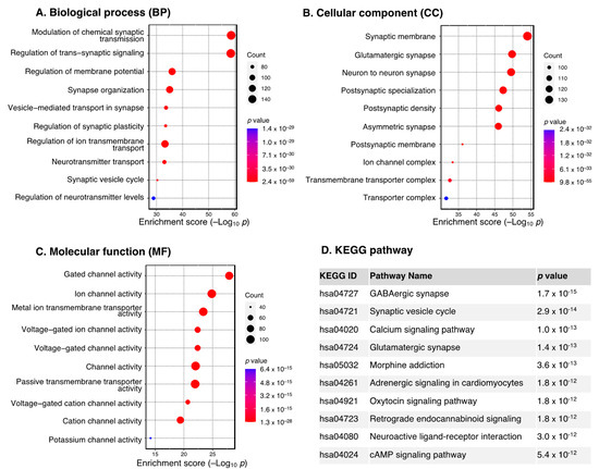 Downregulated DEGs, on the other hand, were mostly enriched in the regulation of synaptic structure and function, as seen from the GO terms (BP: modulation of chemical synaptic transmission, regulation of trans–synaptic signaling and synaptic plasticity; CC: synaptic membrane, glutamatergic synapse; MF: gated and ion channel activity) (Figure 3A–C). This is also in line with the KEGG results, which revealed GABAergic synapse, synaptic vesicle cycle, and calcium signaling pathway as the three most significant pathways (Figure 3D).