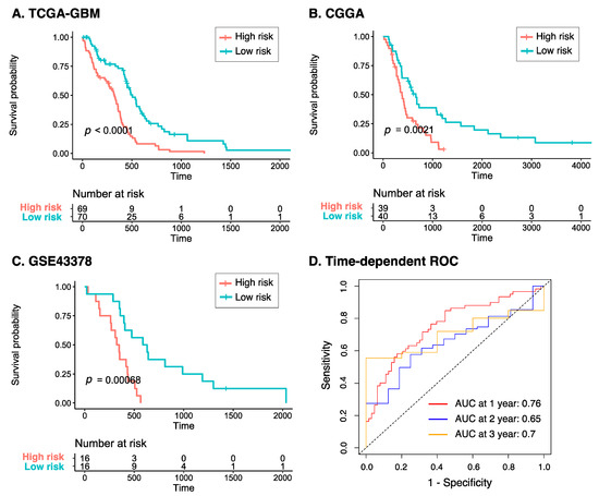 Participants were subsequently classified into the high- and low-risk group based on their risk score being higher or lower than the median cutoff value. To validate the predictive power of this prognostic model beyond the TCGA-GBM dataset, we applied Formula (1) for GBM patients from the Chinese Glioma Genome Atlas (CGGA) database and from the GEO dataset GSE43378 [8,22]. The GSE43378 dataset contains gene expression and survival data of 32 patients with GBM. Furthermore, using the R package timeROC, we tested the performance of the risk model as a marker for GBM over time in the TCGA-GBM dataset [23]. In contrast to the standard receiver operating characteristic (ROC) curve analysis which regards the marker value and disease status of a person as fixed for the whole study period, time-dependent ROC allows these variables to change over time, which better reflects conditions in real life [24].