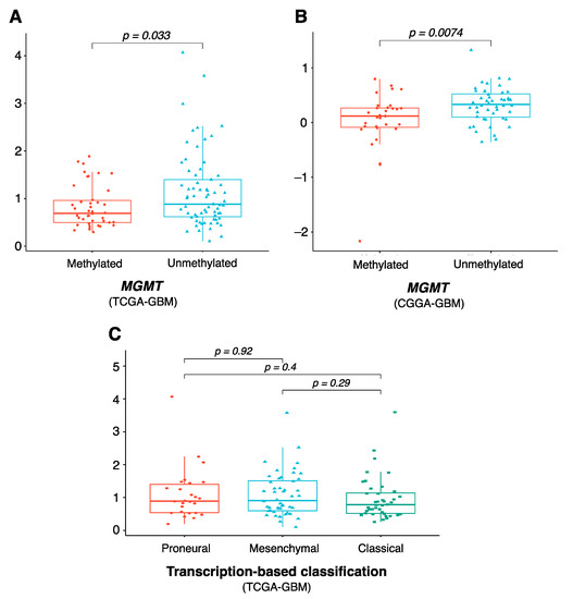 As our eight-gene risk model was able to prognostically classify patients with GBM, we next sought to examine its correlation with other clinical characteristics of GBM, including molecular subtypes and MGMT status. Figure 5A,B show that the risk score in MGMT-methylated GBM patients was significantly lower than that of MGMT-unmethylated patients in both the TCGA and CGGA datasets (p value 0.03 and 0.007, respectively), which is consistent with the fact that patients with MGMT-unmethylated tumors have poorer prognosis and are less responsive to standard therapies [36]. This suggests that while MGMT was not among the genes in our risk model, it could partly explain the model’s prognostic role. We further compared the risk score in different molecular subtypes of GBM, in which we excluded data for the neural subtype, as this subtype was found to have a high content of non-tumor cells [25,28]. Figure 5C shows that the risk score did not differ significantly between the proneural, mesenchymal and classical tumors, consistent with previous reports that there were no significant differences in survival outcome between these three subgroups [25].