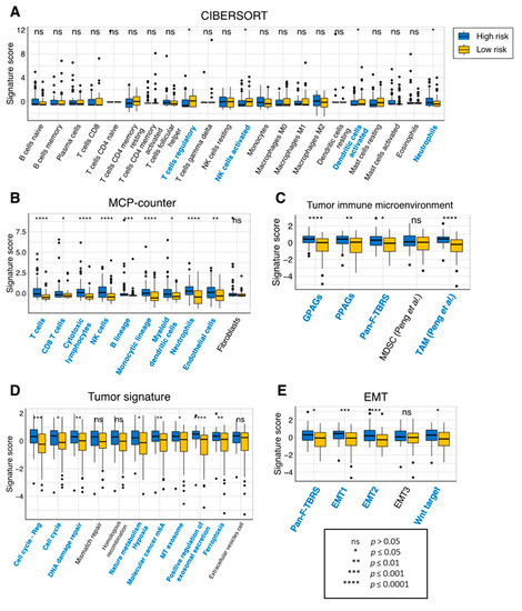 Immune infiltration of the prognostic risk score model in TCGA-GBM. Infiltration levels of immune cells between the high- and low-risk groups using the (A) CIBERSORT or (B) MCP-counter method. Comparison of measures of (C) the tumor immune microenvironment, (D) the tumor signature and (E) EMT between the high- and low-risk groups. Immune cells which had significantly different signature scores between the two risk groups are colored in blue. p values were obtained using the Wilcoxon test. Abbreviations: EMT, epithelial–mesenchymal transition; GPAGs, good-prognosis angiogenesis genes; MCP-counter, microenvironment cell populations-counter; MDSC, myeloid-derived suppressor cells; NK, natural killer; ns, not significant; Pan-F-TBRS, Pan-fibroblast TGF-β response signature; PPAGs, poor-prognosis angiogenesis genes; TAM, tumor-associated macrophages.