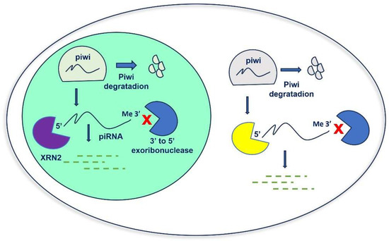 To summarize, in the primary pathway, piRNA forms a complex with PIWI proteins to mediate transposon silencing. In the secondary pathway, piRNA binds to Aub protein to produce secondary piRNA, while secondary piRNA binds to Ago3 to produce primary piRNA, and the cycle continues [9] (Figure 1). Although with some differences, the piRNA ping-pong mechanism exists not only in germ cells but also in somatic cells [14]. Despite increasing interest in the role of piRNAs in human diseases, their homeostasis in cells is still a poorly understood process. RNAs’ cellular concentration is maintained by a balance of biogenesis and degradation. PIWI proteins protect piRNAs from this degradation. However, when piRNAs are released from the PIWI complex, their 5′ end and 3′ end become unprotected and can easily be accessed by exoribonucleases. The degradation of human piRNAs is mainly dependent on the 5′-3′ exoribonuclease pathway mediated by XRN1 and XRN2, the two major 5′-3′ exoribonucleases involved in piRNA degradation in human somatic cells (Figure 2). It was also reported that the presence of 3′-end 2′-O-methylation in piRNAs reduced their degradation through an exosome-mediated decay pathway [16].