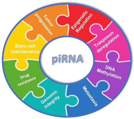 piRNA involvement in different biological processes, hallmarks of cancer, such as tumor progression, epigenetic regulation, transposon deregulation, DNA methylation, metastasis, genomic integrity, drug resistance, and stem cell maintenance.
