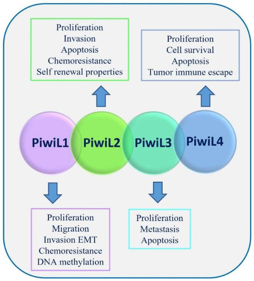 PIWI family proteins consist of four members crucial for the biogenesis and function of small ncRNAs: PIWIL1, PIWIL2, PIWIL3, and PIWIL4. PIWIL proteins bind piRNAs, as a unique type of small ncRNA, forming a PIWI/piRNA complex. This complex exerts the gene regulation function, playing an important role in the stability and integrity maintenance of the germ cell genome [8]. PIWI/piRNA acts as an epigenetic modulator recruiting other epigenetic regulatory factors, such as DNA methylase, beyond its function of directly cutting and degrading target RNA, acting like an Ago protein/miRNA complex. PIWI family proteins have been considered prognostic markers for various malignancies [29]. Although specific mechanisms need further investigation, various studies have demonstrated that PIWI proteins, expressed in many cancers, affect multiple biological processes, also without interacting with piRNAs, including different steps of cancer progression such as cell proliferation, apoptosis, migration, invasion, cell cycle regulation, and self-renewal [30] (Figure 4). Specific examples of PIWIL proteins involved in cancer are described below. PIWIL1 is the most studied PIWI protein that regulates gene expression, apoptosis, cell cycle, and proliferation. PIWIL1 is a coactivator of adenomatous polyposis coli C-terminal domain C complex that targets cell adhesion protein, Pinin, for proteolytic ubiquitination, thus promoting metastasis in pancreatic cancer (PC) [31]. PIWIL2 overexpression functions as an oncogene; its deregulation plays an important role in cancer progression and is associated with poor survival and aggressive clinicopathological properties of patients [32]. The deregulation of PIWIL3 is reported in many cancer types; it is highly expressed in both primary ovarian cancer (OC) and metastatic tissues [33]. PIWIL3 plays an important role in melanoma, and its expression correlates with the tumor stage [34]. In gastric cancer (GC), PIWIL3 upregulation increases cell proliferation, migration, and invasion [35]. Conversely, PIWIL3 overexpression seems to have a protective effect in glioma cell lines and decreased tumor size in vivo [36]. Moreover, PIWIL3 is considered a prognostic biomarker of breast cancer (BC) since its upregulation is significantly associated with poor overall survival [37].