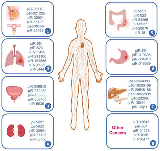 Schematic representation of the piRNAs localization in various cancer types. 1: Breast and ovarian cancer; 2: lung cancer; 3: prostate cancer; 4: renal cancer; 5: colon rectal cancer; 6: gastric cancer; 7: pancreatic and biliary cancer; 8: other cancer type.