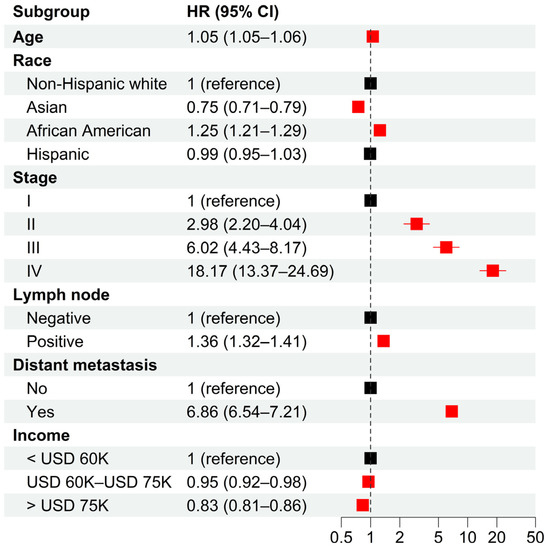 Hazard ratios of clinical characteristics for cancer-specific death in 2004–2018 from multivariable Cox models. Multivariable Cox models were adjusted for age, race, tumor stage, lymph mode involvement, distant metastasis, and income. In paratheses, 95% CIs are presented. Red color indicates a significance level of p < 0.05.