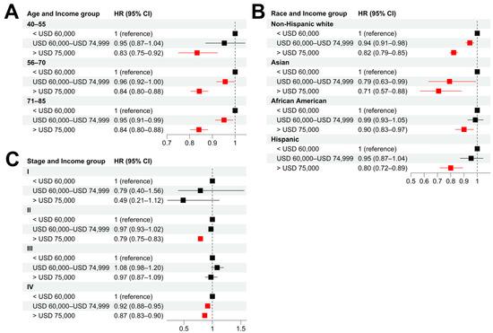Socioeconomic disparities in different patient subgroups. (A–C): Hazard ratios of income for cancer-specific death in patient subgroups stratified by age (A), race (B), and tumor stage (C) using low-income (<USD 60,000) group as baseline. Multivariable Cox models were adjusted for age, race, tumor stage, lymph mode involvement, distant metastasis, and income. In paratheses, 95% CIs are presented. Red color indicates a significance level of p < 0.05.