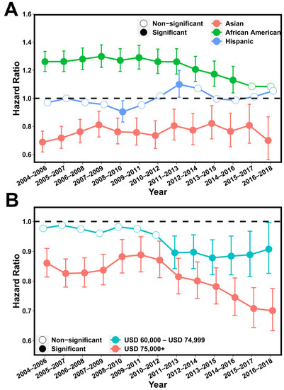 The change in racial and socioeconomic disparity from 2004 to 2018. (A): Hazard ratio of Asians, Blacks, and Hispanics for cancer-specific death using non-Hispanic whites as baseline. Multivariable Cox models were adjusted for age, tumor stage, lymph mode involvement, distant metastasis, and income. (B): Hazard ratio of intermediate-income (USD 60,000–USD 74,999) and high-income (>USD 75,000) groups for cancer-specific death using low-income (<USD 60,000) group as baseline. Multivariable Cox models were adjusted for age, race, and tumor stage. p values below 0.05 were considered significant.