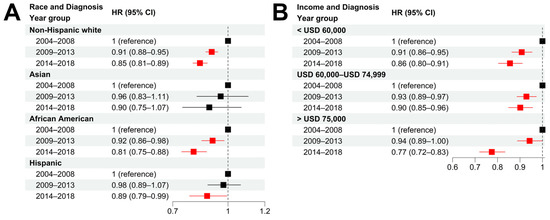 Survival improvements in different race and socioeconomic groups. (A,B): Hazard ratios of diagnosis year for cancer-specific death in patient subgroups stratified by race (A), and income (B) using non-Hispanic white and low-income (<USD 60,000) group as baseline, respectively. Multivariable Cox models were adjusted for age, race, tumor stage, lymph mode involvement, distant metastasis, and income. In paratheses, 95% CIs are presented. Red color indicates a significance level of p < 0.05.